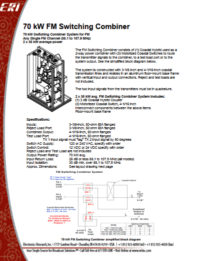 The FM Switching Combiner consists of (1) Coaxial Hybrid used as a 2-way power combiner with (3) Motorized Coaxial Switches to route the transmitter signals to the combiner, to a test load port or to the system output. See the simplified block diagram below. The system is constructed with 3-1/8 inch and 4-1/16-inch coaxial Line and resides in an aluminum floor-mount base frame with vertical input and output connections. The two input signals from the transmitters must be in quadrature.