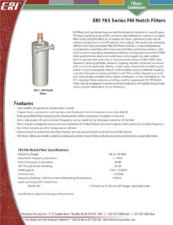The ERI Model 785 is a compact FM Notch Filter rated to handle up to 35 kW. It is available as a single cavity or multiple cavities can be combined for higher suppression of a single frequency or rejection of multiple FM channels.