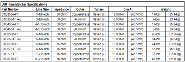 ERI UHF coaxial fine matcher are flanged on both ends for the UHF television broadcast band (470 to 806 MHz). ), fixed flanges and includes one captivated inner connector and one flange hardware kit. 7 tuners. 18-inches flange to flange. Tuners include locking nuts and pressure-tight caps. Does not include mounting brackets or hardware. These are available from ERI at additional cost.