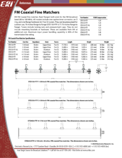 ERI coaxial fine matchers, are fixed flanged both ends with models available for FM, High Band VHF, and UHF broadcast bands. Most models include one captivated inner connector and one flange hardware kit. Tuners include locking nuts and pressure-tight caps. They do not include mounting brackets or hardware. These are available from ERI at additional cost. Maximum input power handling capability is 90% of transmission line rating.