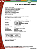 The CY321 is a coaxial UHF switchless power combiner that combiner two (2) UHF transmitters into a single output. The system includes a motorized three-position phase shifter. This is a compact floor mounted unit that can combine two power amplifiers of up to 7.5 kW each for combined output power of 15 kW.