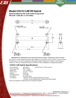 ERI manufactures a wide array of hybrid splitters/combiners for all broadcast bands. The FM hybrid product line includes standard designs for applications from one kilowatt to 280 kilowatts. Product offering are available for indoor applications as well as specialized pressurized designs for outdoor applications, even for very harsh environmental conditions.