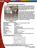 The Model 430 is a high-power, broadband version of isolation transformer within ERI’s full line of isolation transformers. The Model 430 was developed for use across the entire commercial FM band (92.1 MHz to 107.9 MHz), in order to allow multiplexed Master FM Antenna systems to be mounted on AM transmission towers.
