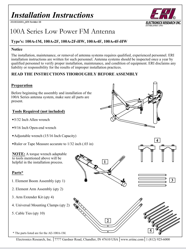 Installation Instructions - 100A Series Low Power FM Antenna Type 100A-1M, 100A-2F, 100A-2F-HW, 100A-4F, and 100A-4F-HW Low Power FM antenna. Note that if special configurations or directional FM arrays should follow the installation instructions and drawings that are included with the antenna shipment.